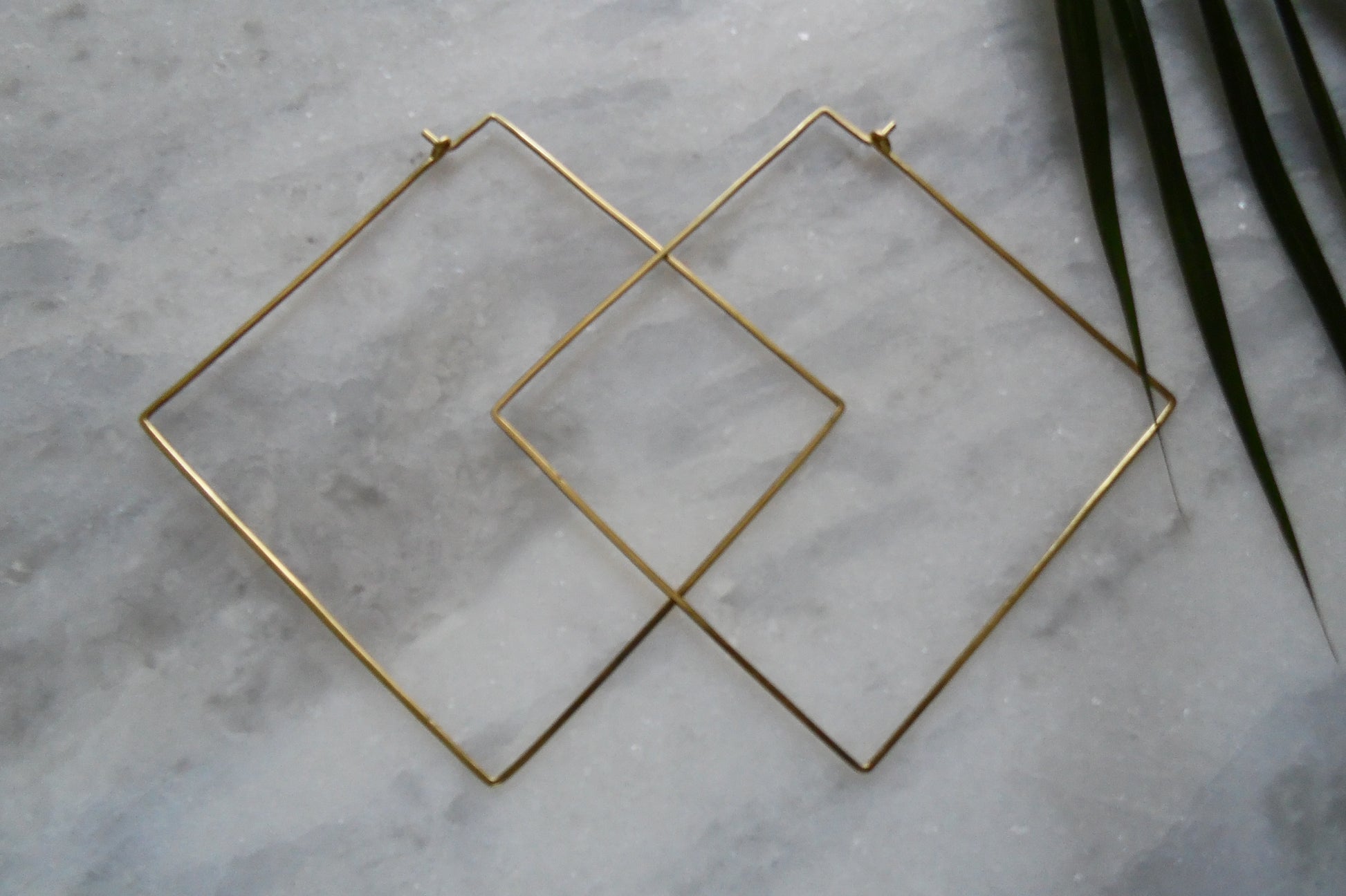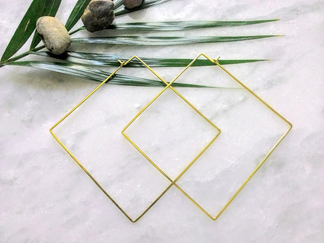 These large diamond shaped hand hammered hoop earrings are made in brass, 14k gold filled and sterling silver. They are lightweight yet bold and the only time it's ok to be square.