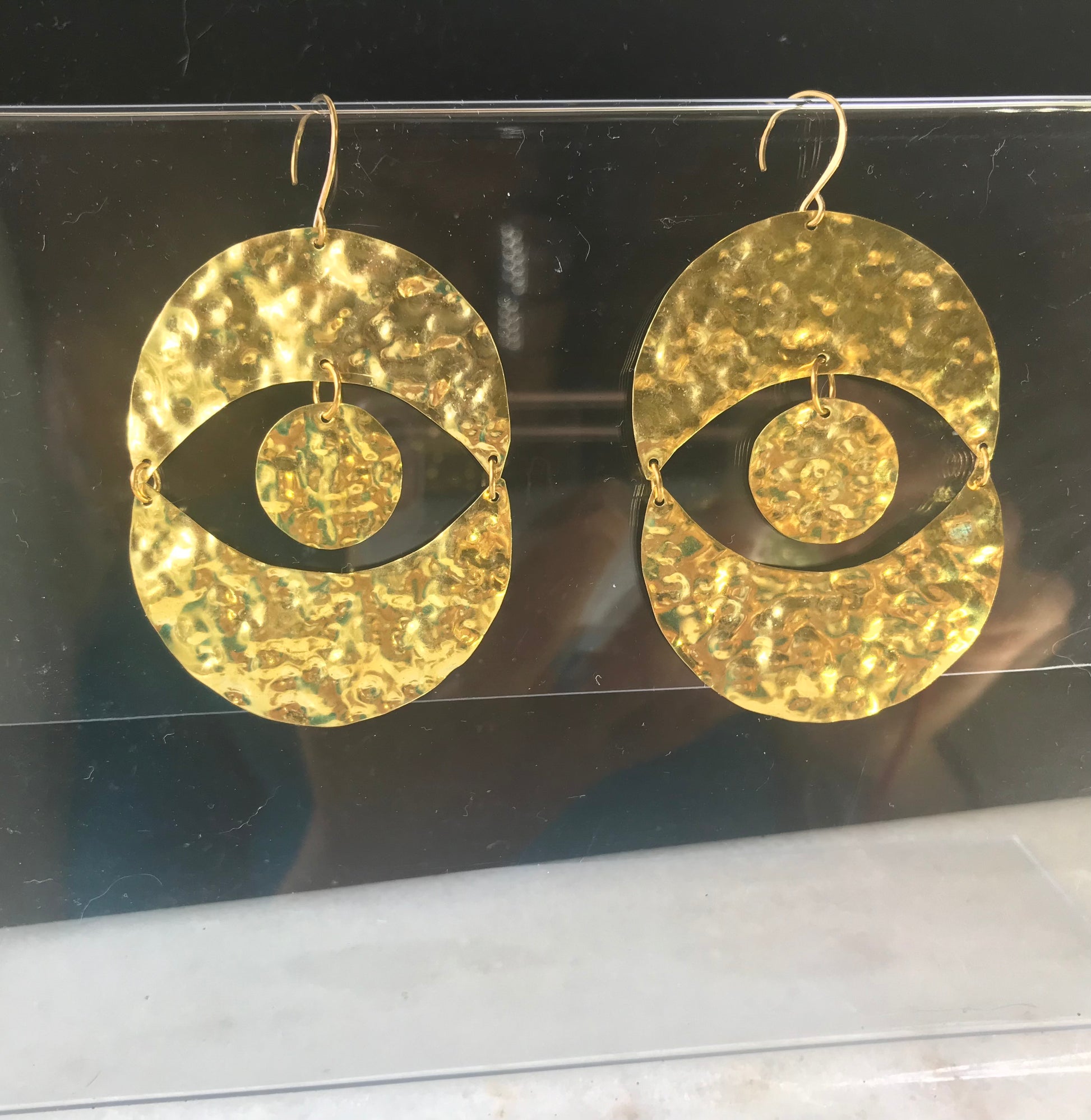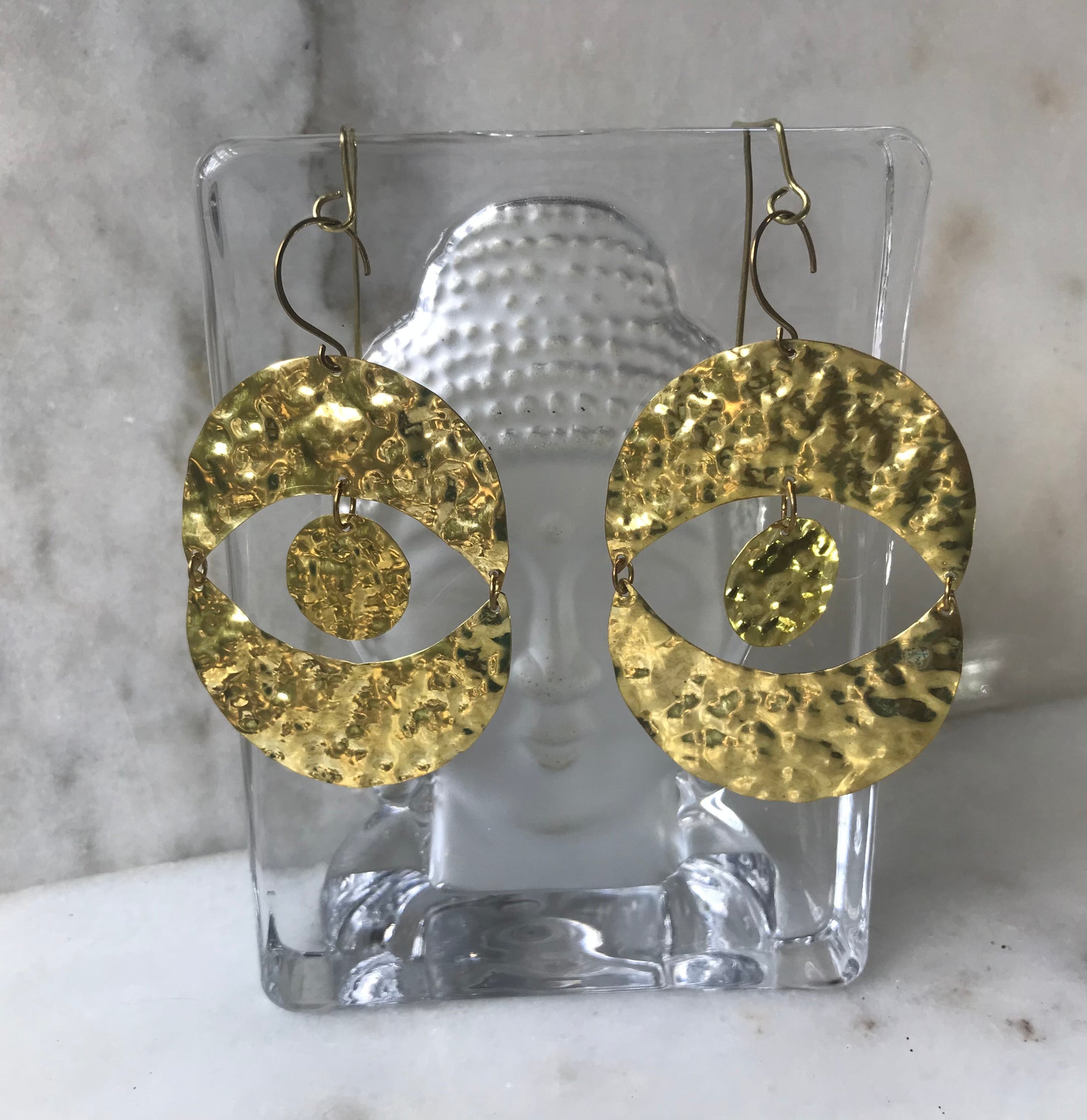 Indulge in the intricate design of these handcrafted brass "evil eye" earrings and experience the powerful protective energy they bring.