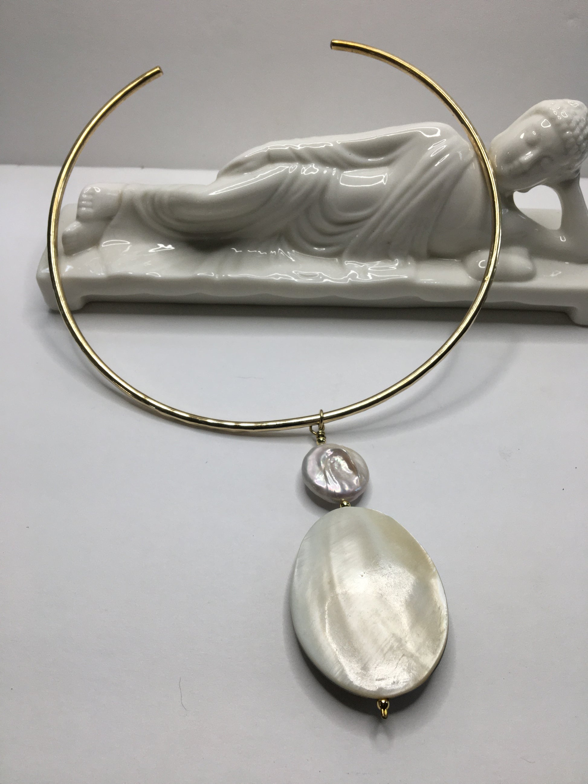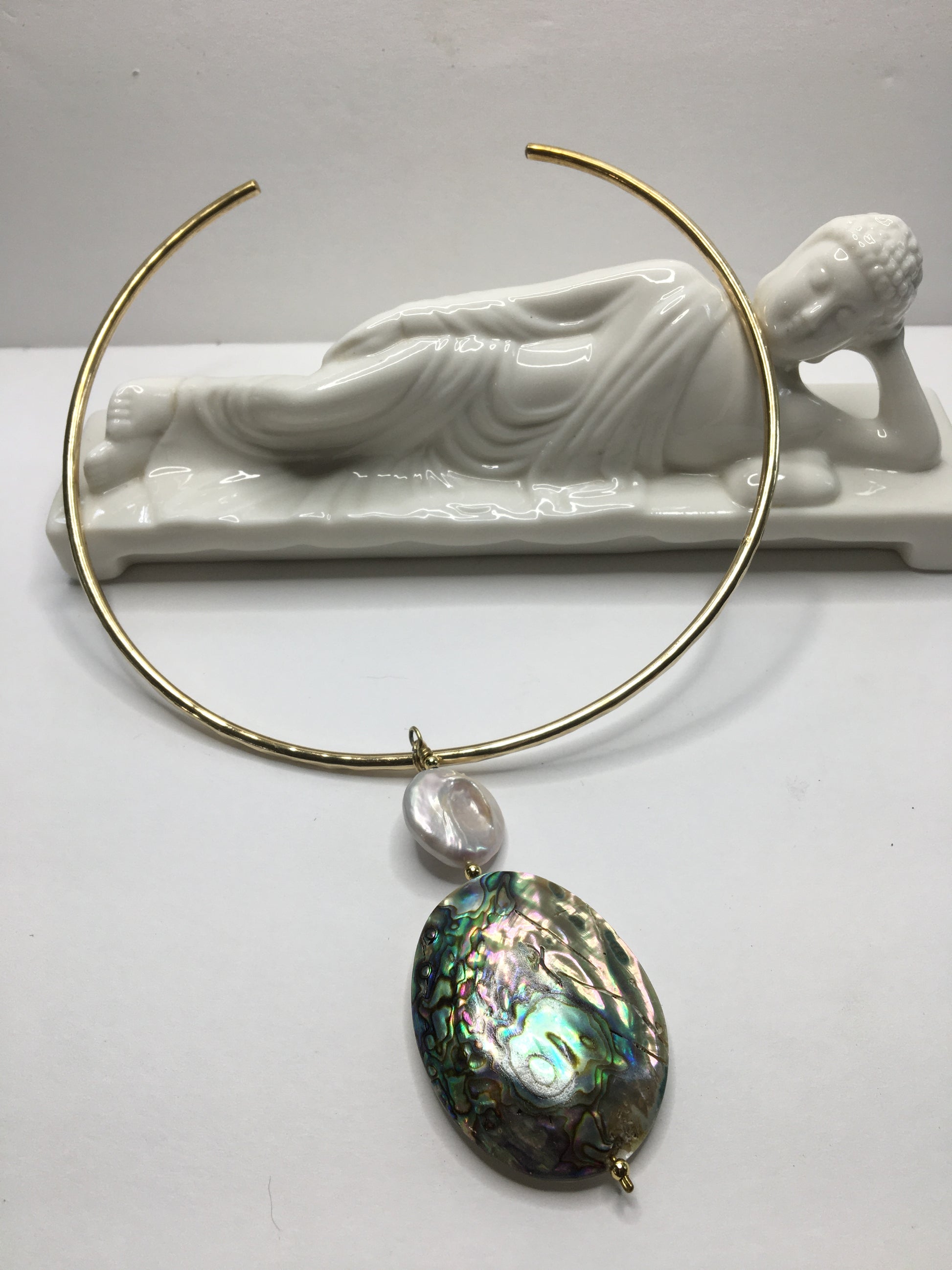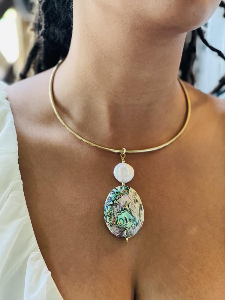 Elevate your style with KELANI, an exquisite amulet featuring abalone and freshwater pearl. The heavy textured brass wire collar is clear coated for easy maintenance and can be worn with the removable amulet on any chain of your choice. Enhance your look and exude elegance with KELANI.