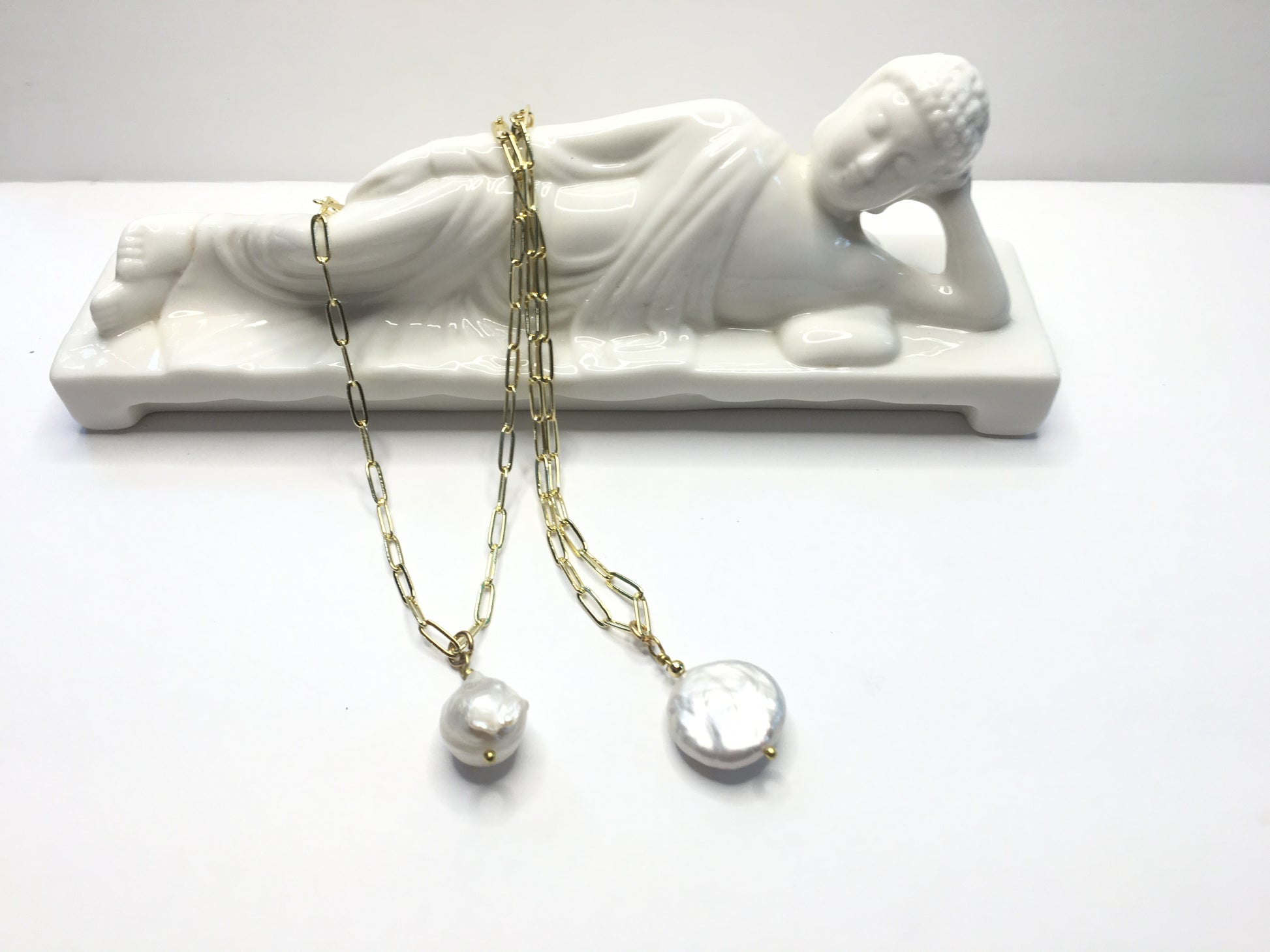 Singular freshwater pearl on adjustable 16 or 18” gold plated chain. Perfect for layering.