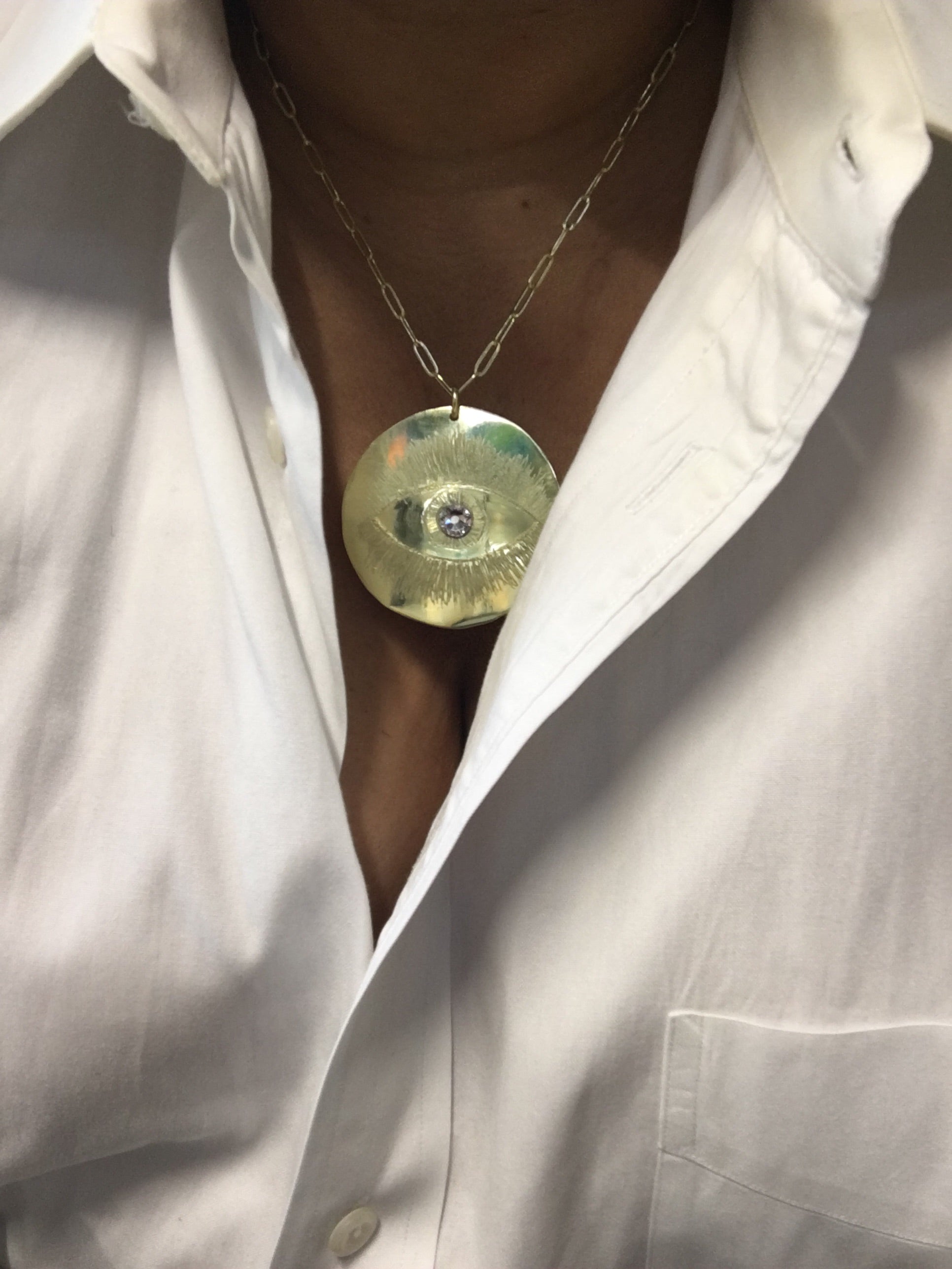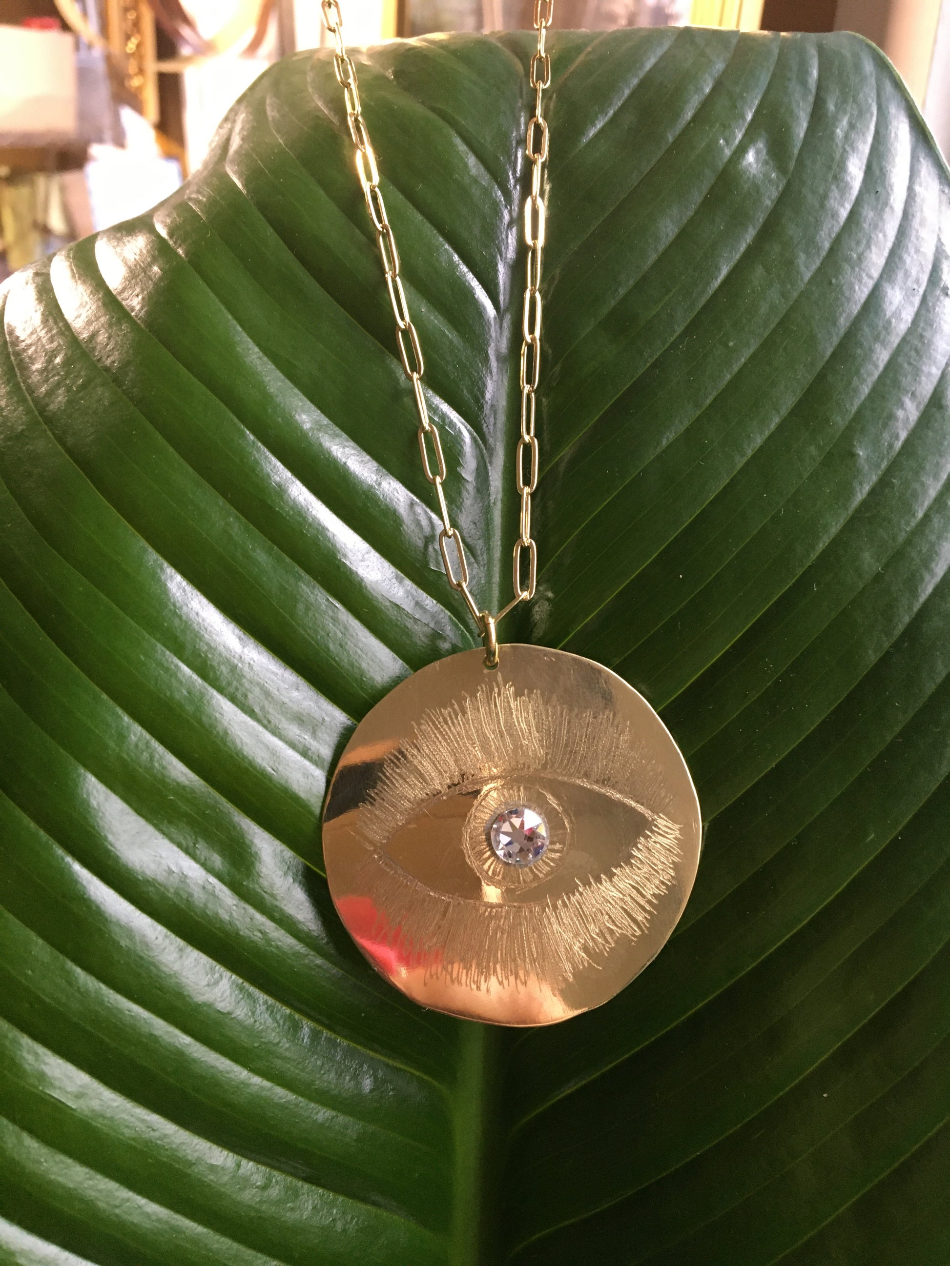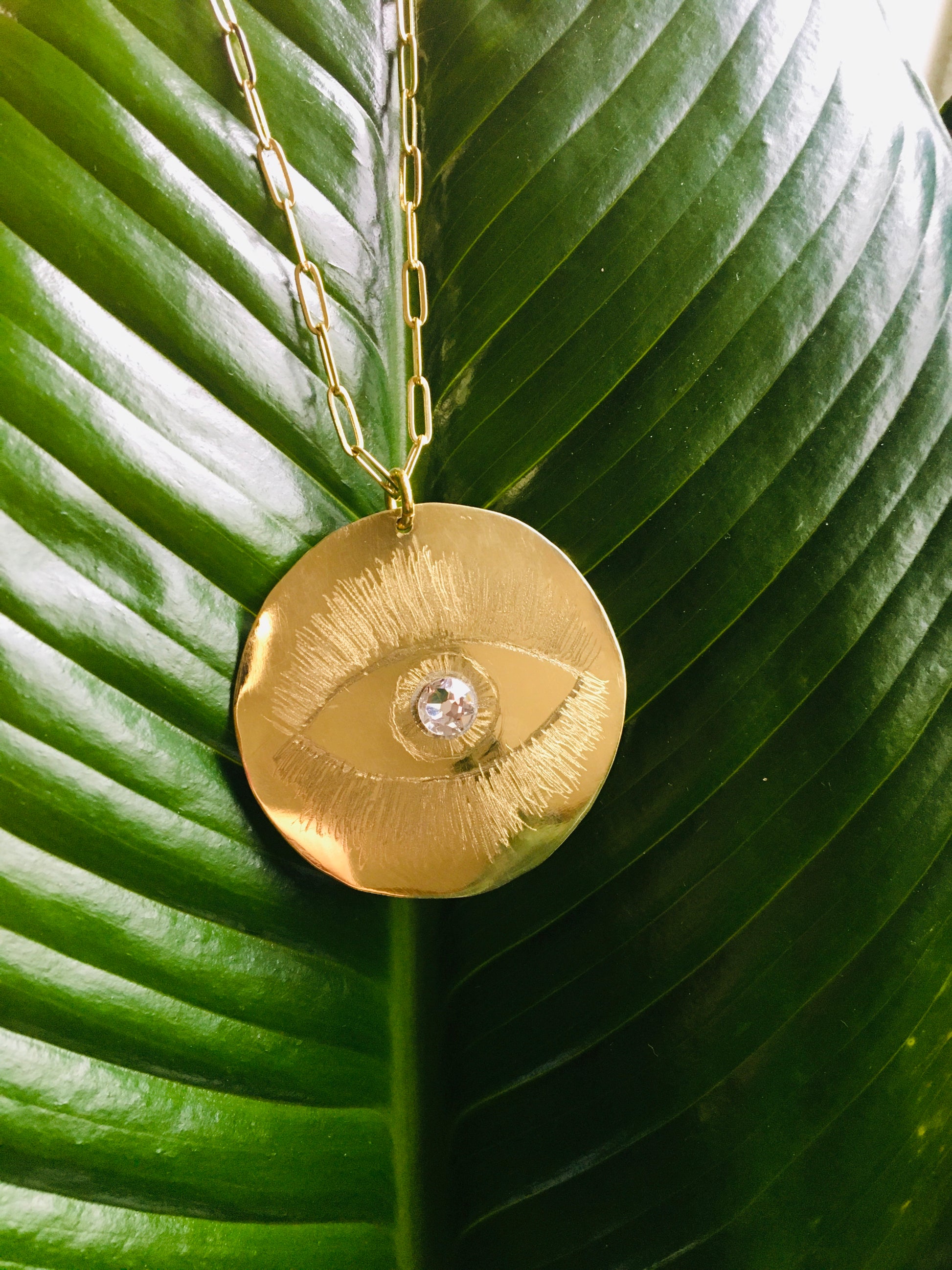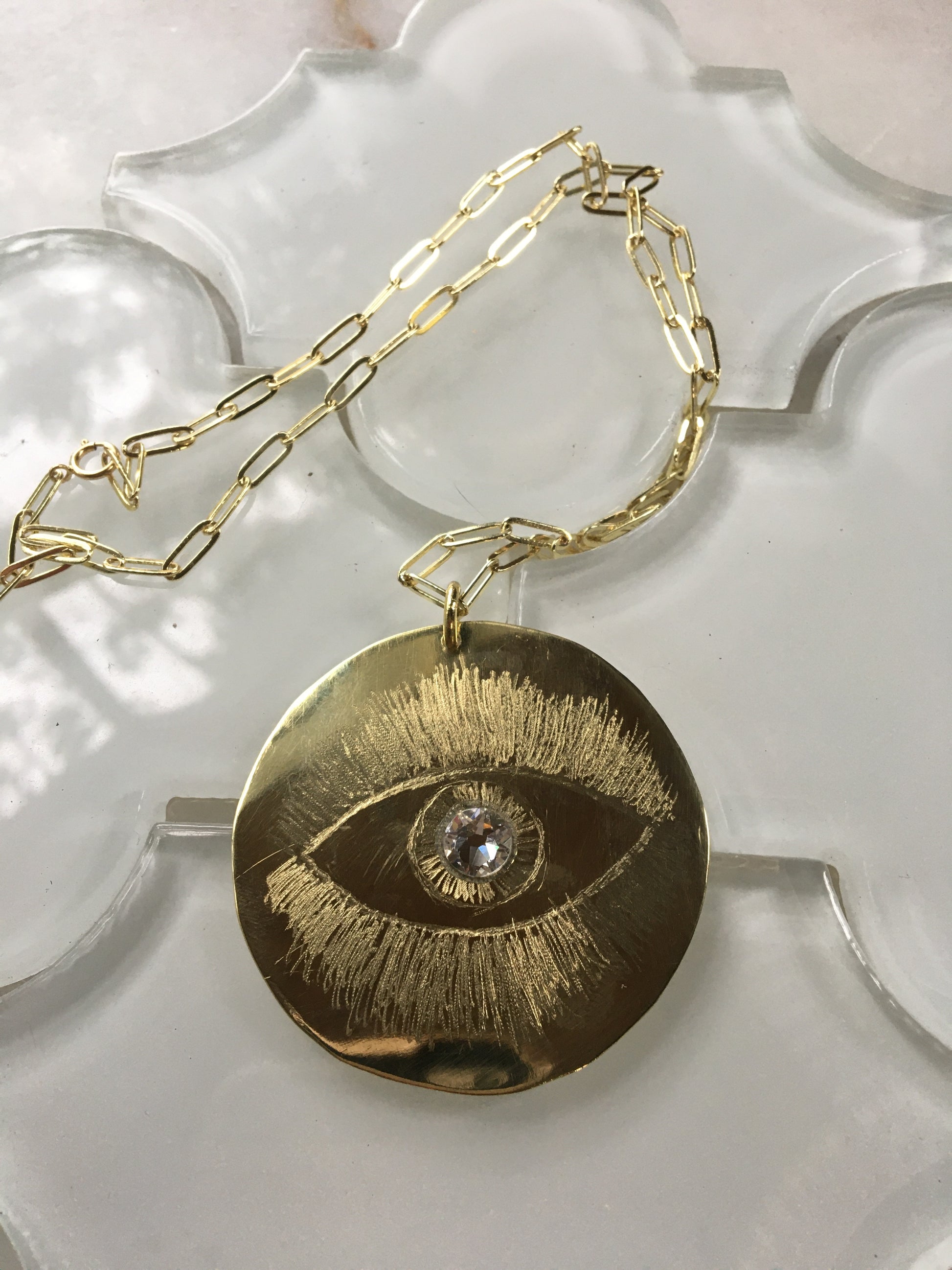 Evil eye amulet hand etched in solid brass with a Swarovski crystal accent. 18” non tarnish gold chain subject to what’s in stock. Chain may vary.