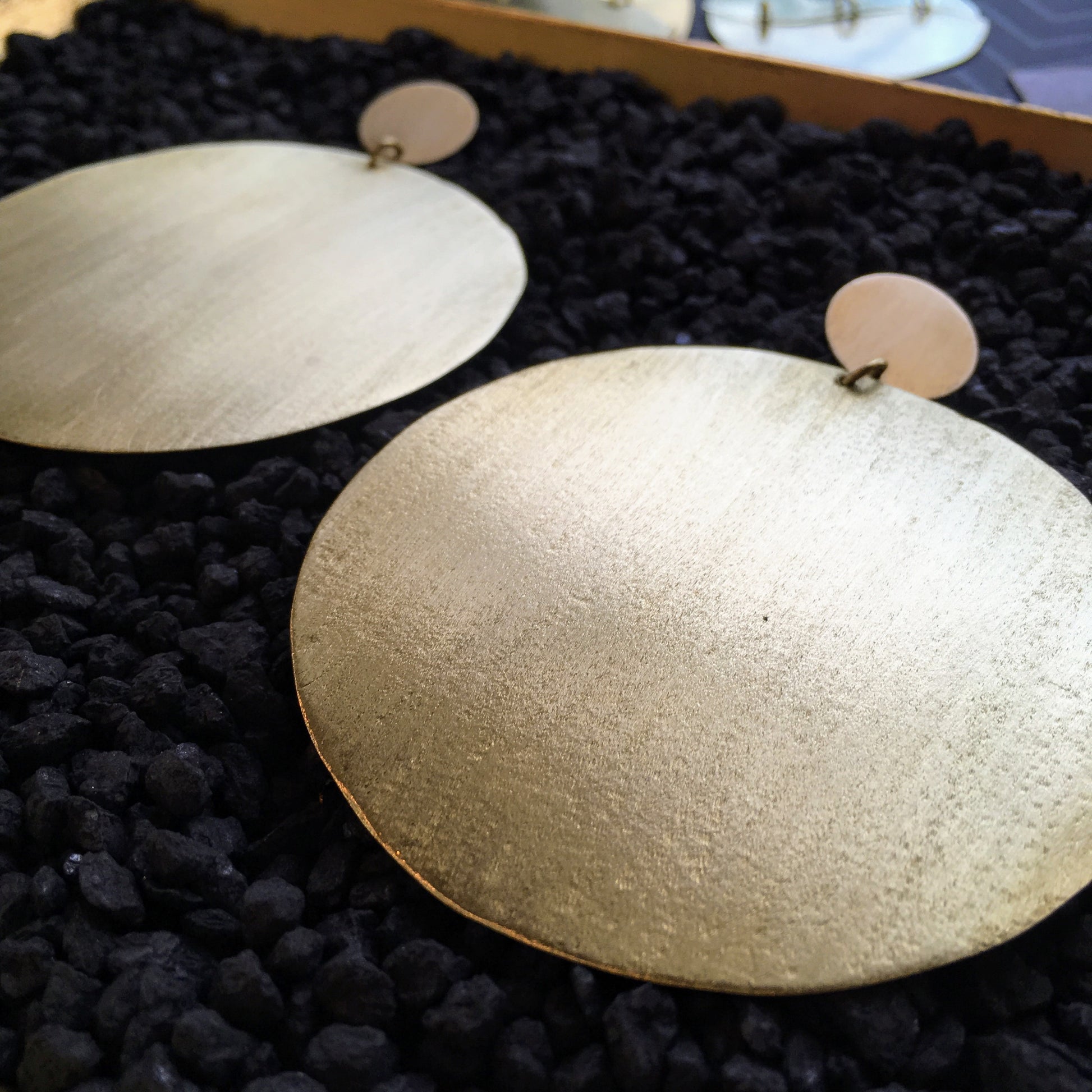 Made in solid brass. Hand cut and polished with an anti tarnish finish. They measure 3 1/2” from the earlobe and have stainless steel ear post and backs.