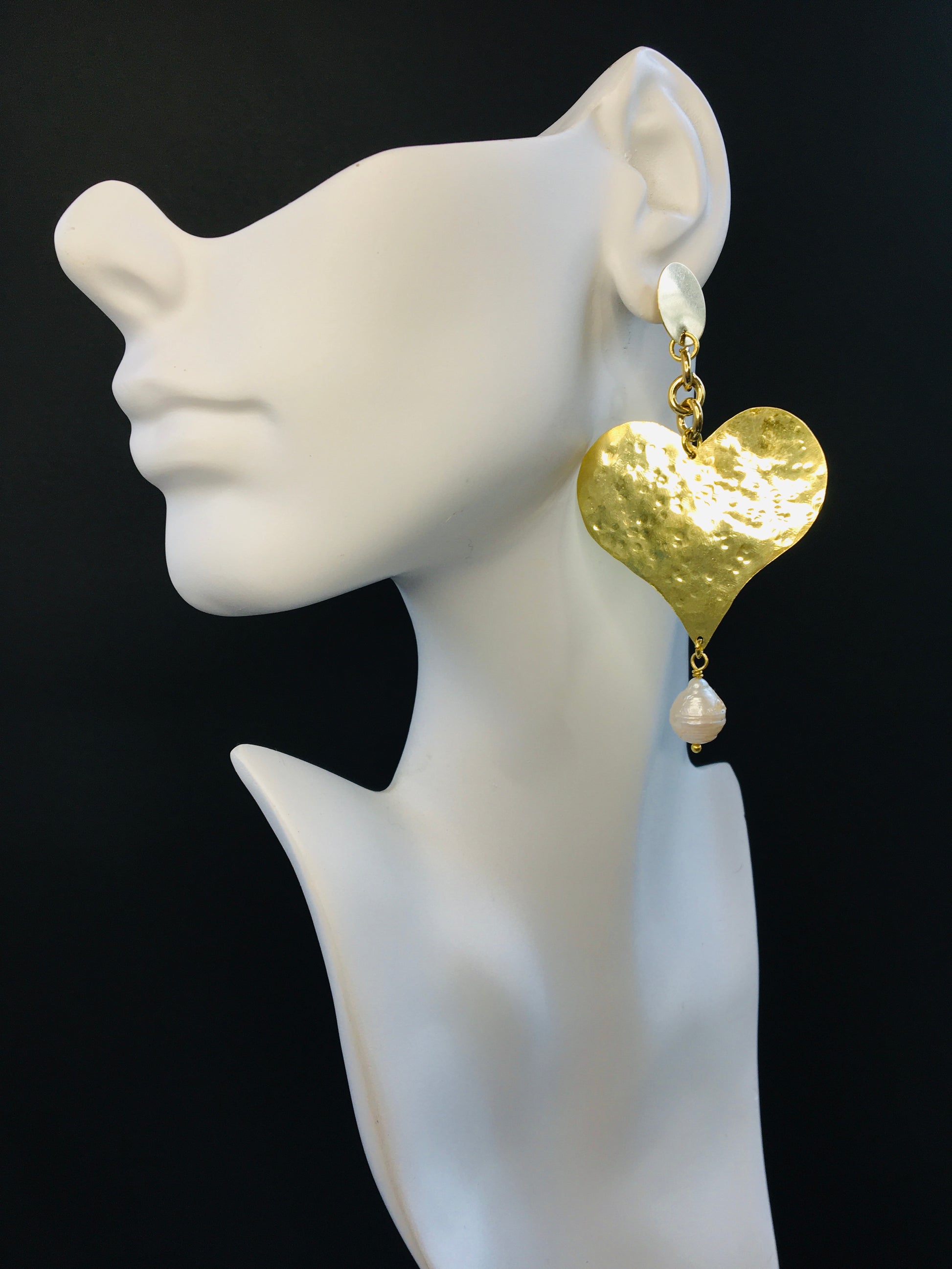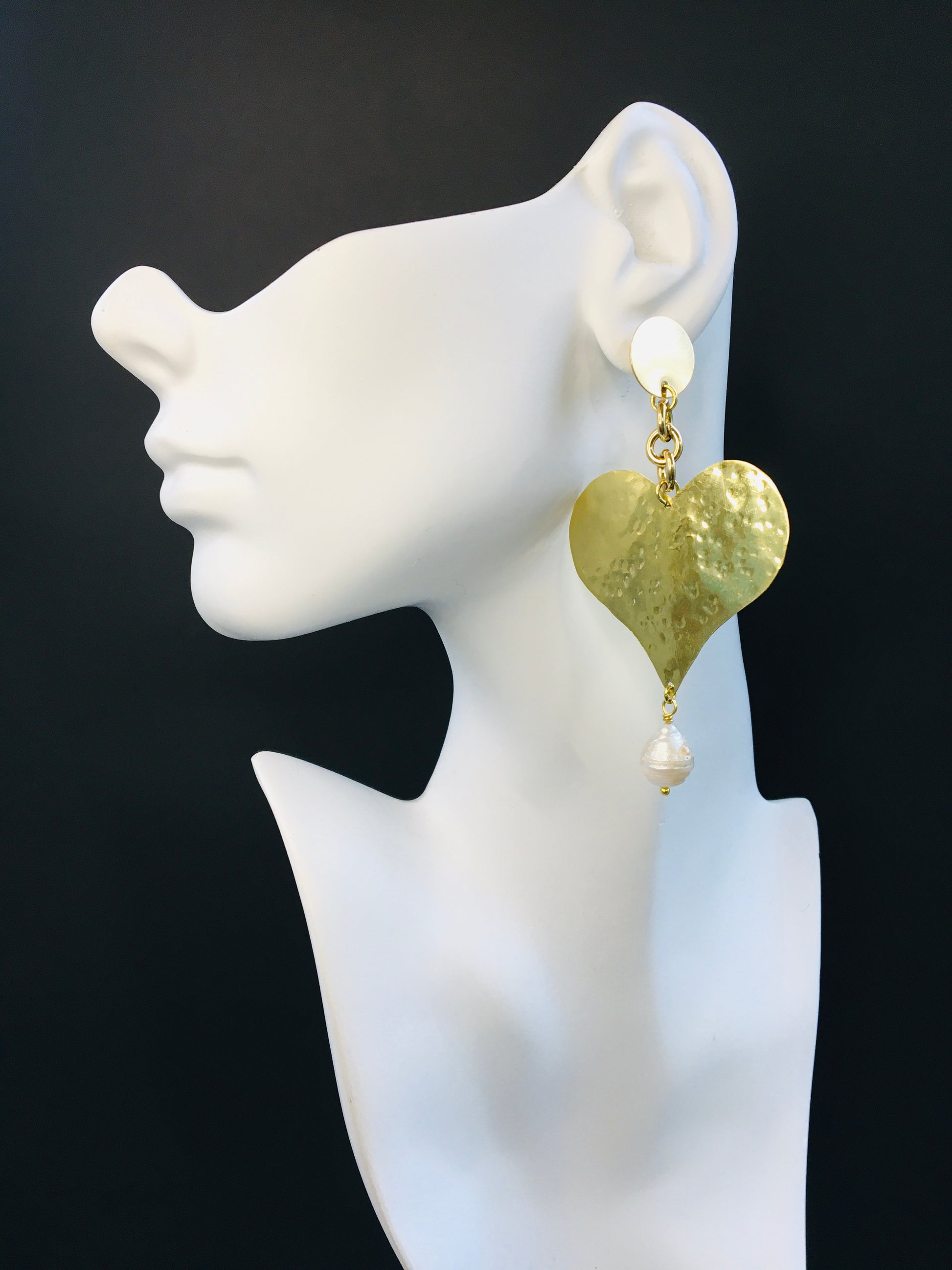 Hand textured brass heart shaped earrings with genuine baroque pearls. Stainless steel post.
